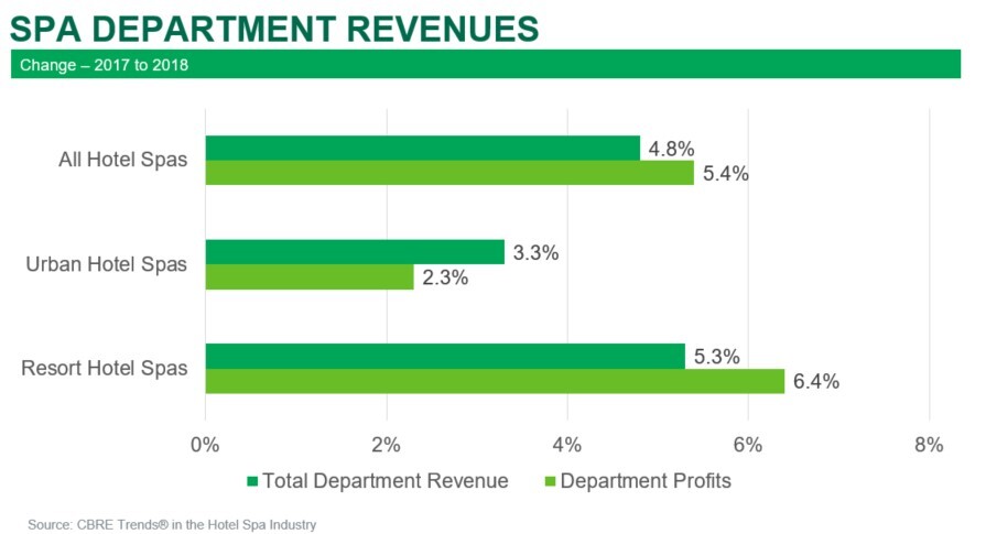 In 2018, both urban and resort hotels experienced increases in spa revenues, of 3.3% and 5.3%, respectively, as well increases in spa department profit. For the first time in seven years, resort hotels (6.4%) showed more significant percentage increases in spa department profit compared to 2.3% at urban properties. This is despite the fact that labor costs increased to a greater degree at resort properties compared to urban properties.