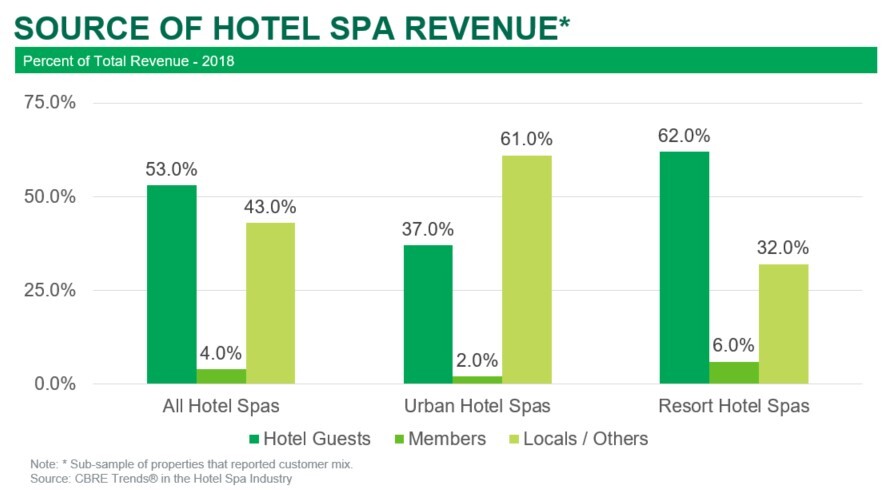 Hotels continue to diversify their spa and wellness offerings to generate more revenue, but it is important to look at the mix of customers. The customer segmentation for all the hotel spas in 2018 included 53% hotel guests, 4% spa members and 43% locals/others. When looking at urban hotel spas, the customer segmentation differs in that the percentage of locals is higher, at 61%. This suggests there is an opportunity for hotel owners to provide packages to entice the local community into their hotel spas for different services. In addition, there is opportunity to convert these local patrons into members and provide a steady income stream.