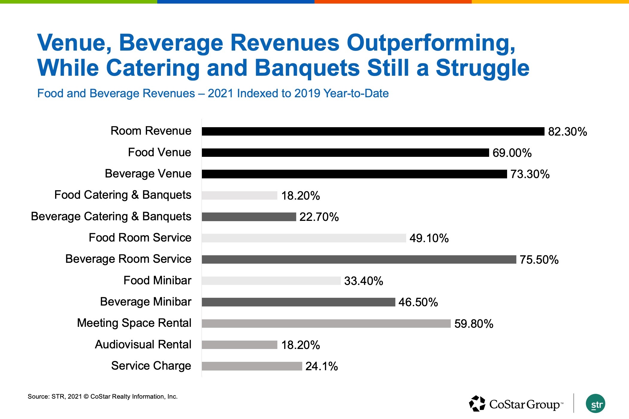 Beverage revenues — principally from the hotel bar — are outpacing food revenues in the recovery, and are nearly two-thirds of what they were in 2019. The real laggard in the food-and-beverage department is catering and banquet revenue as it suffered from a lack of group business during the pandemic.