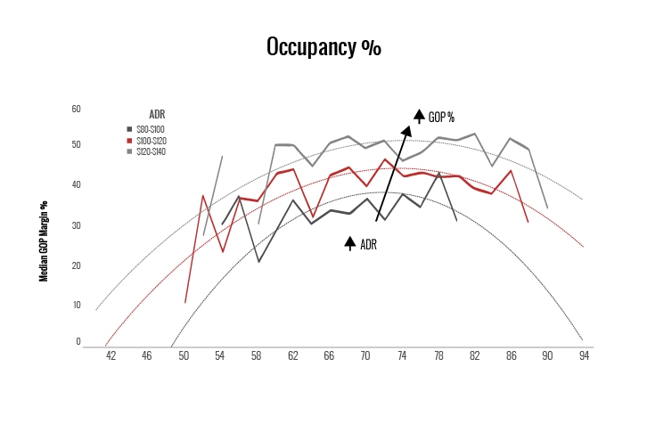 We then compared occupancy and gross operating profit (GOP) margins for the most common ADR ranges within each class and service level. If we chart the median GOP margins by occupancy, we can see where profit margins peak for similar hotel products and ADR levels. The chart below illustrates the median GOP margins at different occupancies for the full-service, upscale segment.