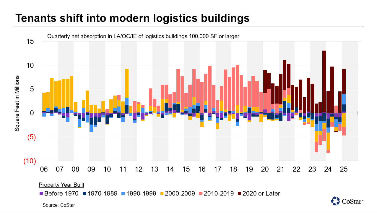The flight to quality trend is on display in Southern California, with tenants moving into a wave of new industrial inventory that's largely concentrated in the Inland Empire, while older buildings have lost occupancy, according to CoStar Senior Director of Market Analytics for Los Angeles Jesse Gundersheim.
