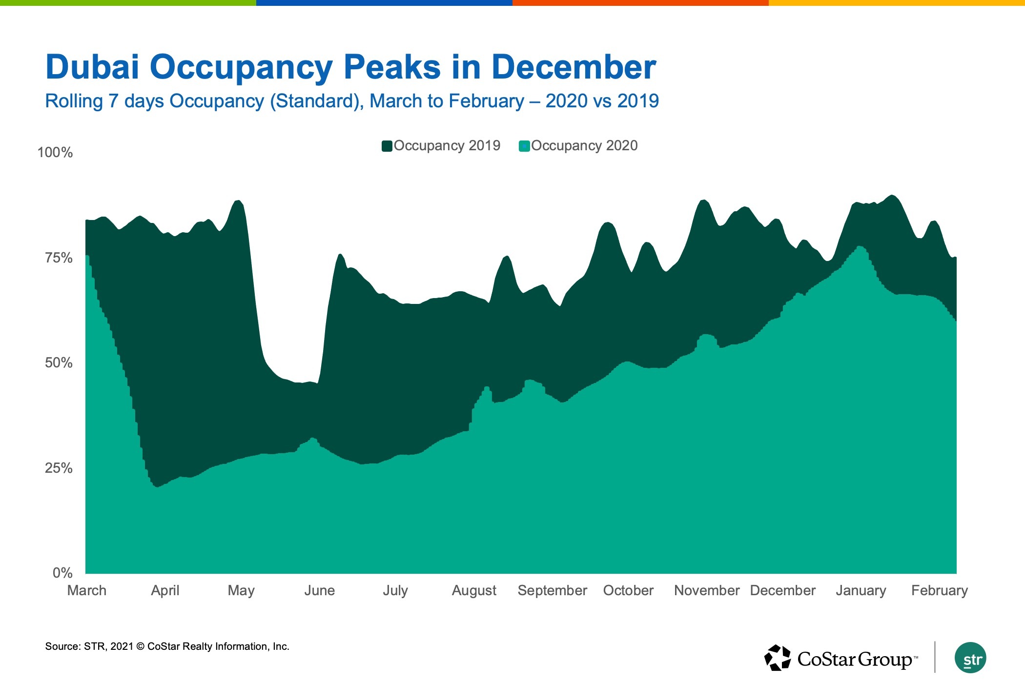 Speaking during the "Market Spotlight: UAE Focus on Dubai" session as part of the online Hotel Data Conference: Global Edition, Philip Wooller — STR's area director for Middle East and Africa — said Dubai has steadily increased on a week-to-week basis from early pandemic occupancies of 20%, climbing to a peak of close to 80% on Dec. 31, 2020. STR is CoStar's hospitality analytics firm.