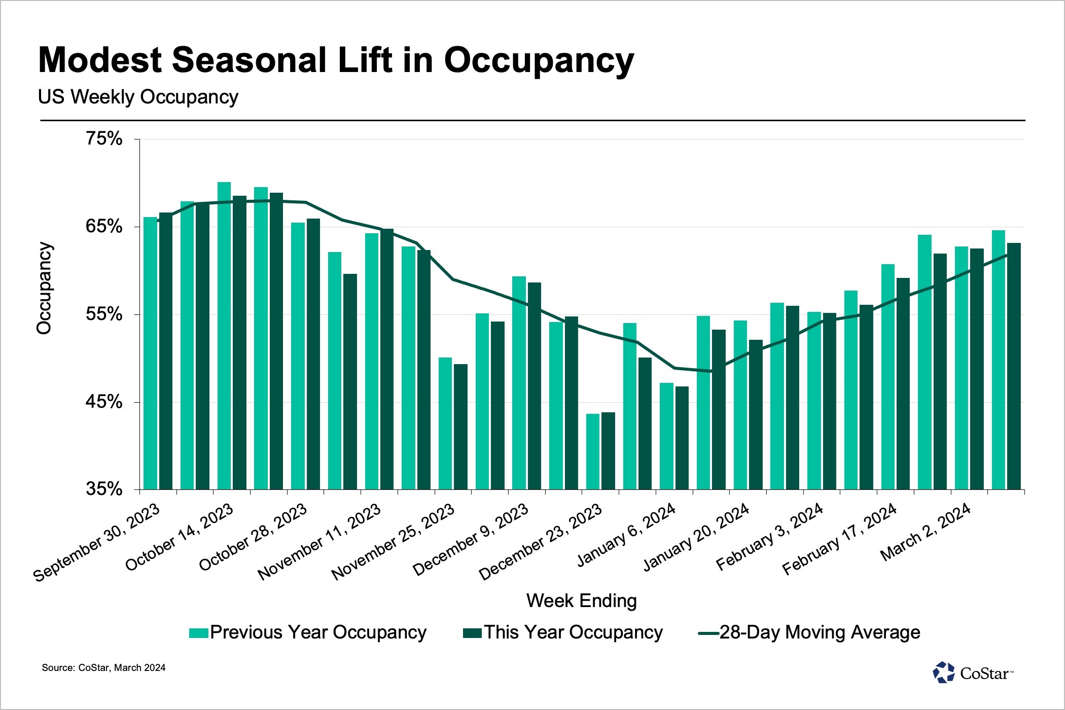 Among the top 25 markets, Minneapolis hotels led the nation with year-over-year RevPAR growth of 45.1% as it hosted the Big Ten Women’s Basketball Tournament. St. Louis and Washington, D.C., also posted double-digit RevPAR growth.