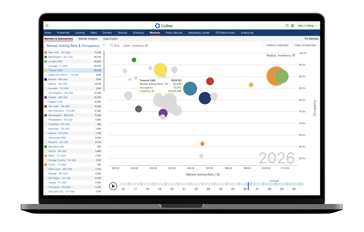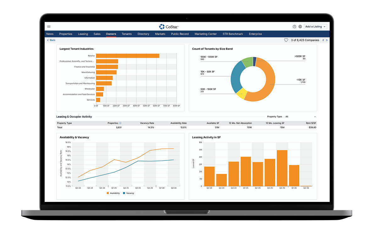 Managing a portfolio effectively means knowing how your assets compare to competitors and how broader market conditions influence demand. CoStar provides visibility into lease expirations, tenant movement and availability across markets, so you can identify exposure sooner, focus attention where it matters most and protect revenue across your portfolio.