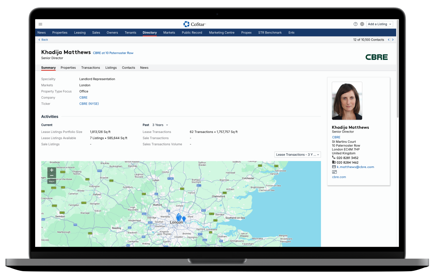 Connect with commercial real estate professionals to identify new opportunities. Search for contacts, locations or companies by specialties, property type expertise, transaction experience, number of current listings, markets served, CoStar awards won and more.