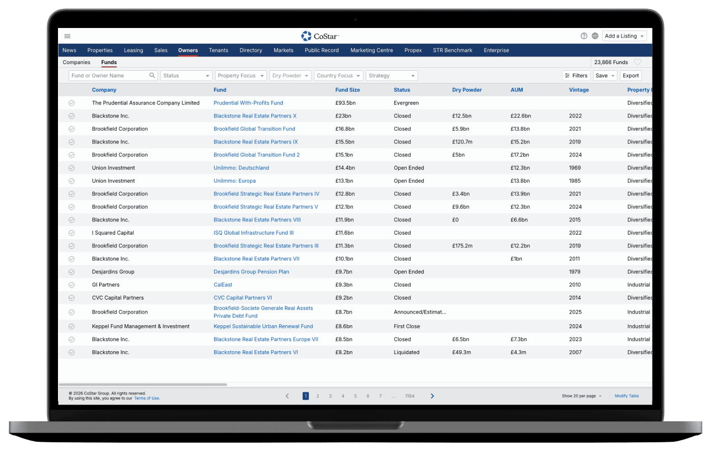 Find new opportunities by searching for funds that meet your requirements using a range of fund and property level criteria. Immediately view the assets they own, transaction history, properties for sale, and assess property performance.