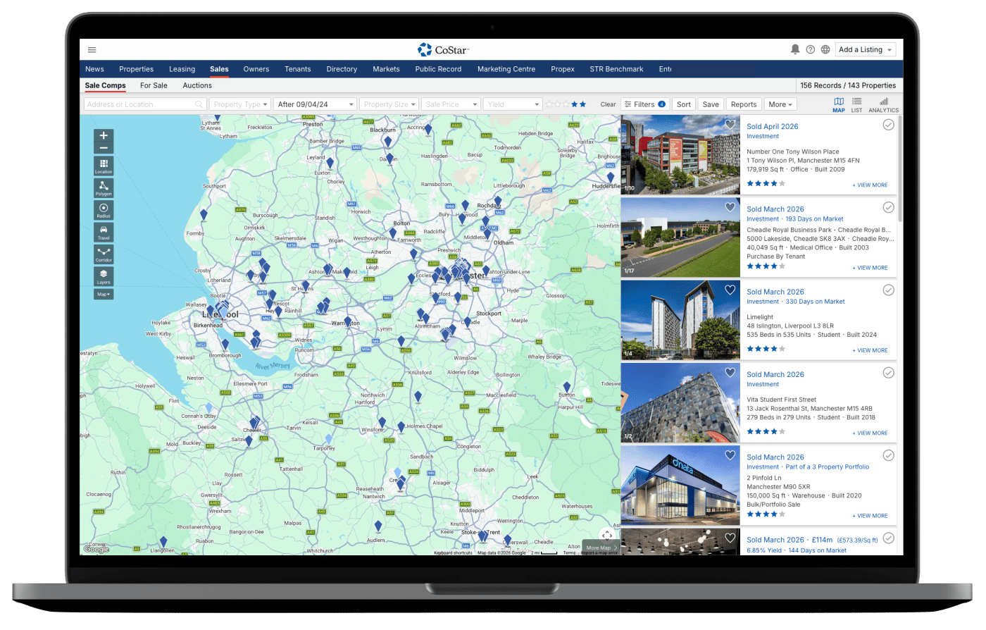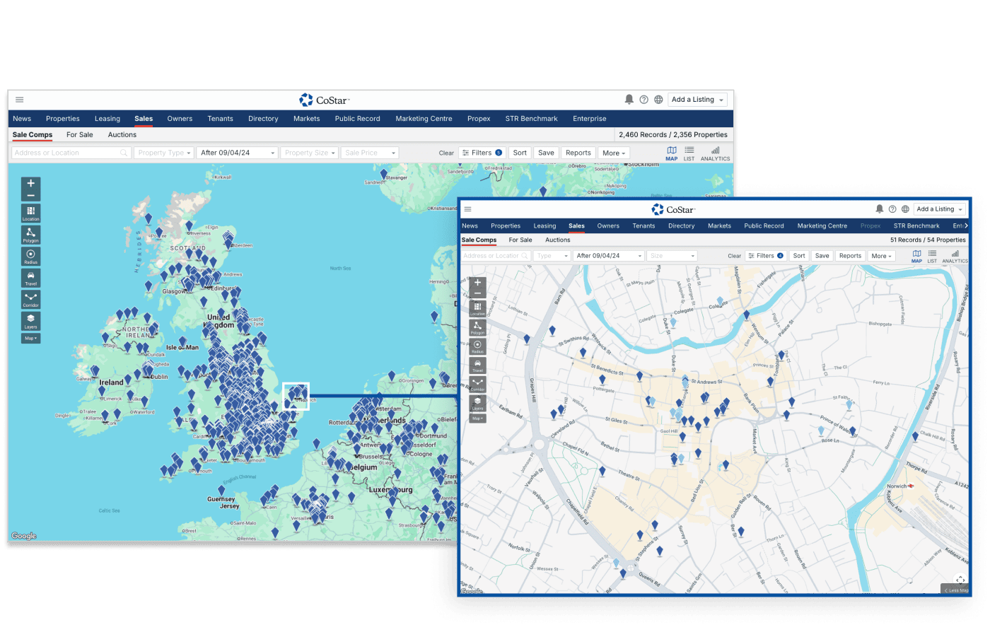 CoStar's intuitive platform makes it easy to find and explore detailed information on commercial real estate sales. Quickly locate and analyze independently verified data on key details including sale date, asking and achieved price, time on market and comprehensive sale notes.