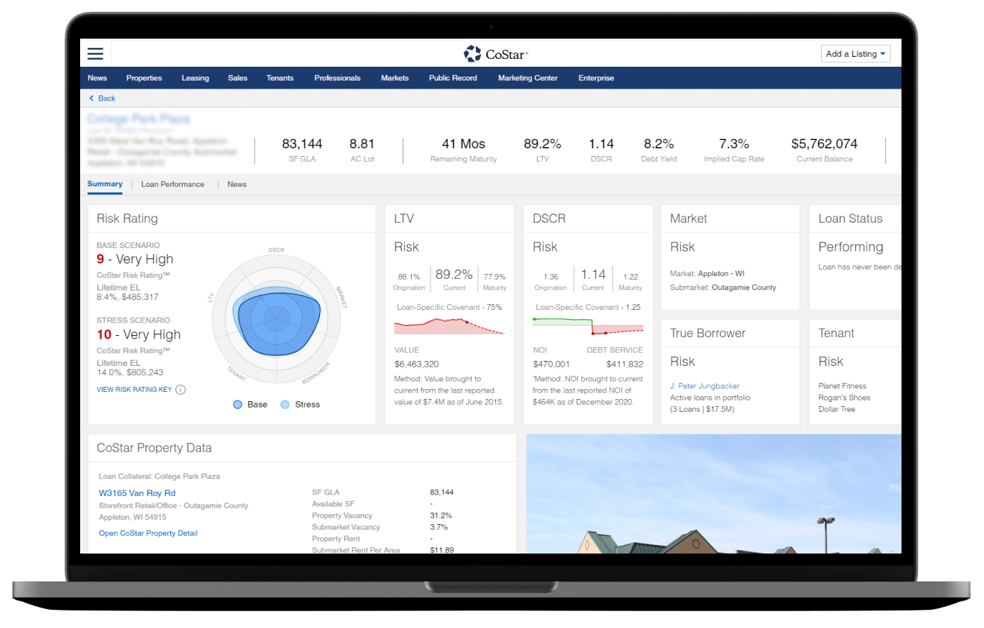 Profitez des informations sur les propriétés, des analyses de marché et du modèle de risque de crédit de CoStar, les plus fiables du secteur.