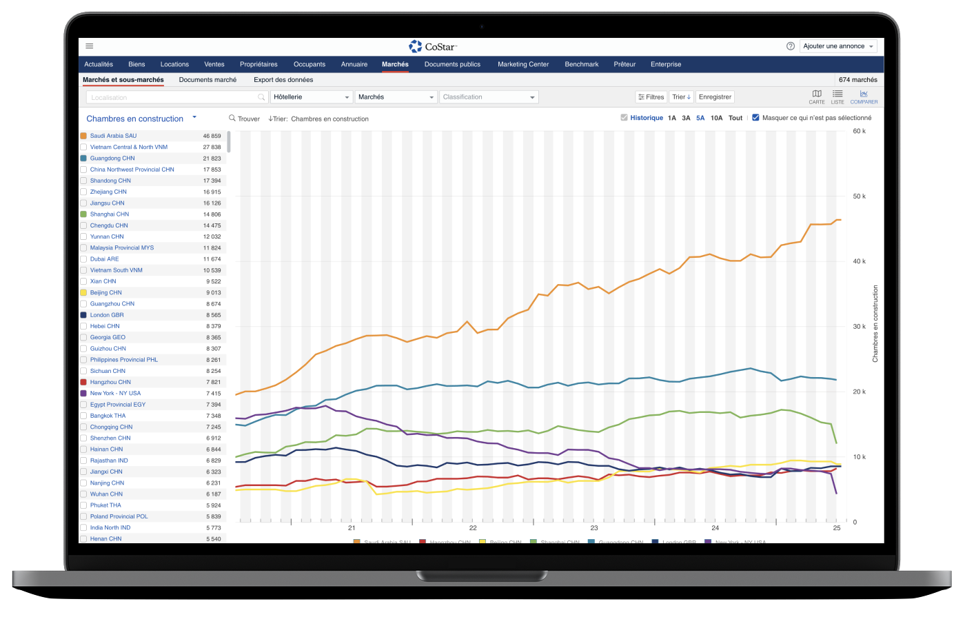 À partir d’une source unique, accédez à des prévisions complètes sur les marchés et les sous-marchés pour orienter votre planification budgétaire. Utilisez les informations sur la rentabilité pour contrôler les dépenses, identifier les tendances opérationnelles et maximiser les profits pour les hôtels individuels ou pour l’ensemble d’un portefeuille. Collaborez avec les équipes de développement pour démontrer aux franchisés potentiels la capacité de la marque à générer des rendements moyens élevés et pour estimer les revenus de la redevance de franchise dans différents secteurs.