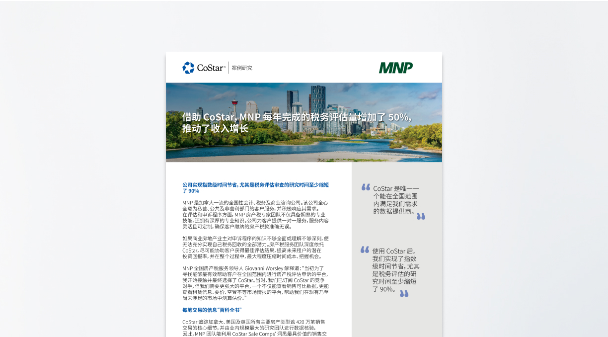 案例研究 了解全球各地的企业如何借助 CoStar 拓展业务、提高效率。 联系我们 中间商 Ken Ashley 执行董事 Cushman & Wakefield 依托 CoStar 的商业房地产数据和市场洞察,推动价值数百万美元的决策制定。CoStar 为公司经纪人提供高效潜在客户开发、实时客户关系建立及深度资产分析的全套工具支持。 X WATCH VIDEO X Scott Chandler 高级常务董事 Marcus & Millichap 借助 CoStar 获得竞争优势。该公司利用 CoStar 进行定制化研究、发掘潜在客户、赢得新业务,并助力新经纪人快速上岗,提高他们的工作效率。 X WATCH VIDEO X 业主 Matthew Hudson 常务董事、投资 私募股权房地产公司 Balfour Pacific 依托 CoStar 加速商业房地产采购进程,并为投资者创造可观回报。CoStar 彻底改变了公司的运营模式,它不仅是发掘新机会的关键尽职调查工具,还能够提供宝贵的市场情报,显著提高了 Balfour Pacific 在多个市场的竞争力。 X WATCH VIDEO X Jason Haun 合作伙伴、高级副总裁 全国性多户家庭和老年生活开发商 Zom Living 依托 CoStar 加快商业房地产采购决策过程,制定更加明智的决策。公司利用 CoStar 市场数据洞悉市场趋势和前景,并借助其基金数据和对比数据来分析交易、验证假设,从而建立竞争优势。 X WATCH VIDEO X 租用方 Bob Ghislandi 选址,房地产战略 国际餐厅品牌 Bonchon 采用 CoStar 来确定其特许经营店可以成功运营的市场和地点。公司借助可直接访问的一流商业房地产数据,简化了市场研究流程,并提高了与经纪人的协作效率。 X WATCH VIDEO X 评估师 François Huot 物业税和评估服务总监 Leyton 将 CoStar 用作风险管理工具,借此展示其在物业、投资组合及市场层面的专业知识,帮助客户制定明智的财务决策。 X WATCH VIDEO X Giovanni Worsley 全国领先 评估师使用 CoStar 后,每年完成的税务评估量增加 50%,税务评估审核的研究时间至少缩短 90%。 下载 下载PDF 贷方 Adam Powadiuk 商业融资助理副总裁 CoStar 帮助 First National Financial 确立顺利达成交易的关键优势,研究时间缩短 90%,贷款流程大幅提速。 X WATCH VIDEO X Rick Bachalo 总裁 CoStar 助力 Canada ICI 加快数据收集和分析流程,从而提升效率并减轻承销资源压力。 X WATCH VIDEO X 供应商 Jim Freiberg 高级业务分析师 Nucor 借助 CoStar 的数据和分析能力确立竞争优势,发现新商机,获取深刻的市场洞察并加强合作伙伴关系。借助单个强大平台,公司能够实现精准定位楼宇业主、追踪市场趋势并推动战略性增长。 X WATCH VIDEO X 了解 CoStar 如何助力您发展业务。请拨打 888-226-7404 联系我们,也可以提交此表申请产品演示。 You must have JavaScript enabled to use this form. 公司 商业类型 商业类型*评估/估价建筑师商业经纪行业住宅经纪行业商业住宅经济行业楼宇服务/供应商建筑公司公司租户非零售商业地产业主酒店业主机构投资者贷款方抵押贷款经纪人/金融专业服务物业管理房地产咨询住宅开发商零售商其他 职务 手机号码 企业电子邮箱 邮编 请输入您的国家/地区 AfghanistanAlbaniaAlgeriaAmerican SamoaAndorraAngolaAnguillaAntarcticaAntigua & BarbudaArgentinaArmeniaArubaAscension IslandAustraliaAustriaAzerbaijanBahamasBahrainBangladeshKosovoBelarusBelgiumBelizeBeninBermudaBhutanBoliviaBosnia & HerzegovinaBotswanaBouvet IslandBrazilBritish Indian Ocean TerritoryBritish Virgin IslandsBruneiBulgariaBurkina FasoBurundiCambodiaCameroonCanadaCape VerdeCaribbean NetherlandsCayman IslandsCentral African RepublicChadChileChinaChristmas IslandCocos (Keeling) IslandsColombiaComorosCongo - BrazzavilleCongo - KinshasaCook IslandsCosta RicaCroatiaCubaCuraçaoCyprusCzechiaCôte d’IvoireDenmarkDjiboutiDominicaDominican RepublicEcuadorEgyptEl SalvadorEquatorial GuineaEritreaEstoniaEswatiniEthiopiaFalkland IslandsFaroe IslandsFijiFinlandFranceFrench GuianaFrench PolynesiaFrench Southern TerritoriesGabonGambiaGeorgiaGermanyGhanaGibraltarGreeceGreenlandGrenadaGuadeloupeGuamGuatemalaGuernseyGuineaGuinea-BissauGuyanaHaitiHeard McDonald IslandsHondurasHong Kong SAR ChinaHungaryIcelandIndiaIndonesiaIranIraqIrelandIsle of ManIsraelItalyJamaicaJapanJerseyJordanKazakhstanKenyaKiribatiKuwaitKyrgyzstanLaosLatviaLebanonLesothoLiberiaLibyaLiechtensteinLithuaniaLuxembourgMacao SAR ChinaMadagascarMalawiMalaysiaMaldivesMaliMaltaMarshall IslandsMartiniqueMauritaniaMauritiusMayotteMexicoMicronesiaMoldovaMonacoMongoliaMontenegroMontserratMoroccoMozambiqueMyanmar (Burma)NamibiaNauruNepalNetherlandsNetherlands AntillesNew CaledoniaNew ZealandNicaraguaNigerNigeriaNiueNorfolk IslandNorthern Mariana IslandsNorth KoreaNorth MacedoniaNorwayOmanOutlying OceaniaPakistanPalauPalestinian TerritoriesPanamaPapua New GuineaParaguayPeruPhilippinesPitcairn IslandsPolandPortugalPuerto RicoQatarRomaniaRussiaRwandaRéunionSamoaSan MarinoSarkSaudi ArabiaSenegalSerbiaSeychellesSierra LeoneSingaporeSt. MartinSlovakiaSloveniaSolomon IslandsSomaliaSouth AfricaSouth Georgia & South Sandwich IslandsSouth KoreaSouth SudanSpainSri LankaSt. BarthélemyTristan da CunhaSt. Kitts & NevisSt. LuciaSt. Vincent & GrenadinesSudanSurinameSvalbard & Jan MayenSwedenSwitzerlandSyriaSão Tomé & PríncipeTaiwanTajikistanTanzaniaThailandTimor-LesteTogoTokelauTongaTrinidad & TobagoTunisiaTurkmenistanTurks & Caicos IslandsTuvaluTürkiyeU.S. Outlying IslandsU.S. Virgin IslandsUgandaUkraineUnited Arab EmiratesUnited KingdomUnited States of AmericaUruguayUzbekistanVanuatuVatican CityVenezuelaVietnamWallis & FutunaWestern SaharaYemenZambiaZimbabweÅland Islands 申请类型 申请产品演示多户式物业经理经纪人买家零售商服务提供商业主和开发商评估师租用方 公共部门 酒店行业贷款方教授和学生STR Benchmark 电子邮件订阅 我同意